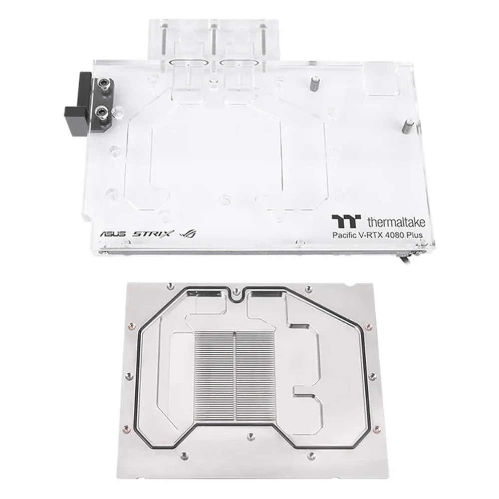 It is made from nickel-plated copper with a clear acrylic top, the Thermaltake Pacific V-RTX 4080 Plus (ASUS ROG & TUF) GPU Water Block delivers excellent thermal conductivity and long-term durability. Standard G1/4” fittings make it easy to integrate into any custom loop.