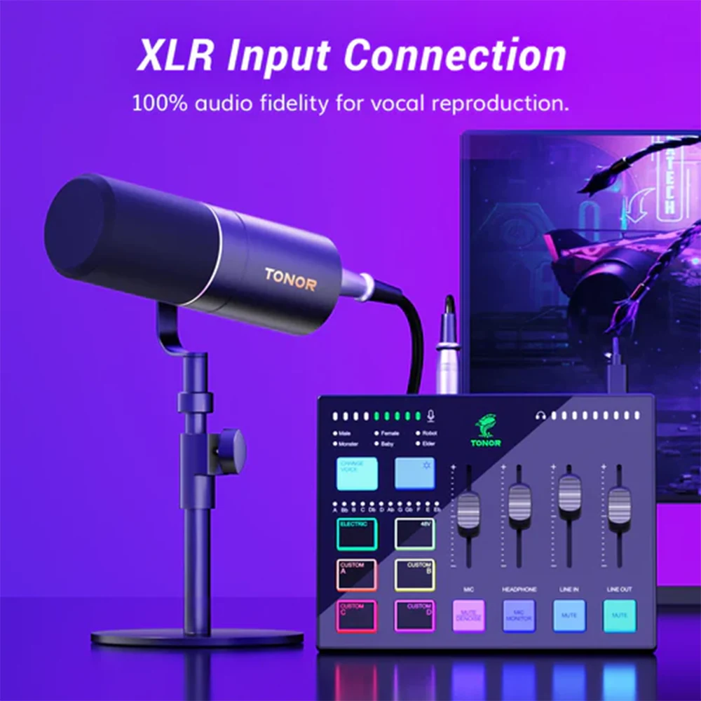 TONOR Gaming Audio Interface, RGB Audio Mixer with Pro-preamp, 6.5mm and XLR Channel, Support for Instrument Input, Independent Volume Controls, for Gaming, Live Streaming, Content Creating